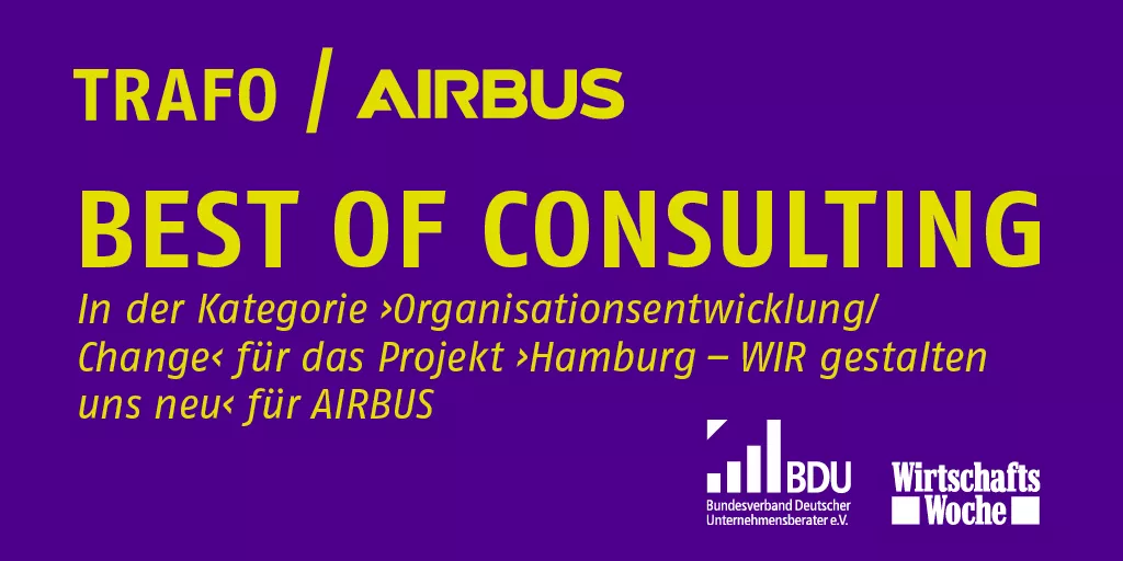 Arbeitgeber- und Arbeitnehmervertreter:innen des Flugzeugbauers trauten TRAFO eine neutrale Moderation, überzeugende Kommunikation, professionelle Unterstützung der Projektleitung, authentisches Coaching von Mitarbeiter:innen sowie eine effiziente Konsolidierung von Projektergebnissen z.B. in Form von Prozessbeschreibungen, Arbeitsmaterialien, Schulungs- & Workshop-Konzepten zu. (So die Bewertung für BestOfConsulting)